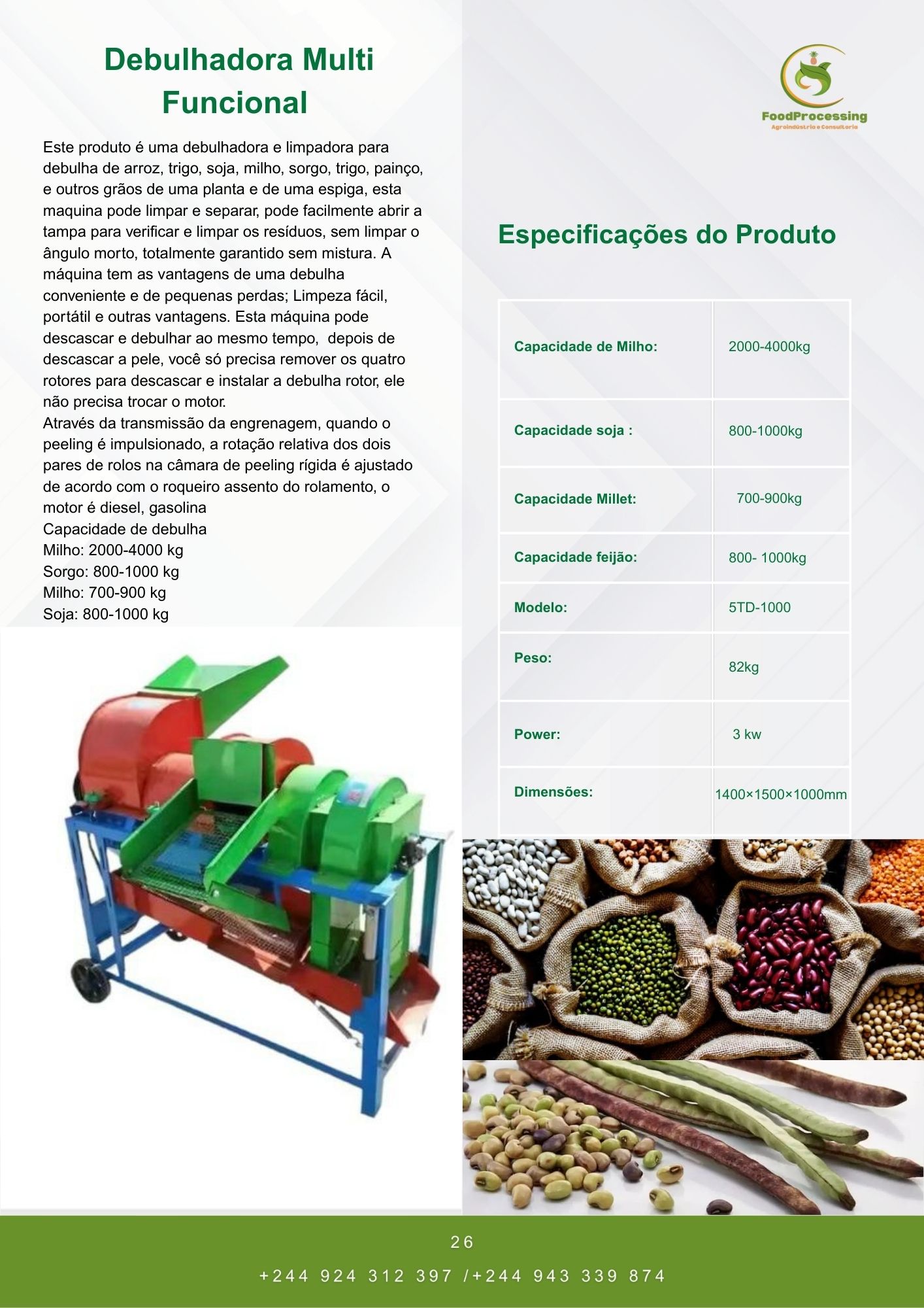 A Debulhadora Multifuncional é um equipamento completo e versátil, projetado para debulhar e limpar diversos tipos de grãos com rapidez, eficiência e mínima perda. Capaz de processar arroz, milho, soja, feijão, sorgo, trigo, millet, entre outros cereais, esta máquina destaca-se pela sua funcionalidade, potência e facilidade de operação.