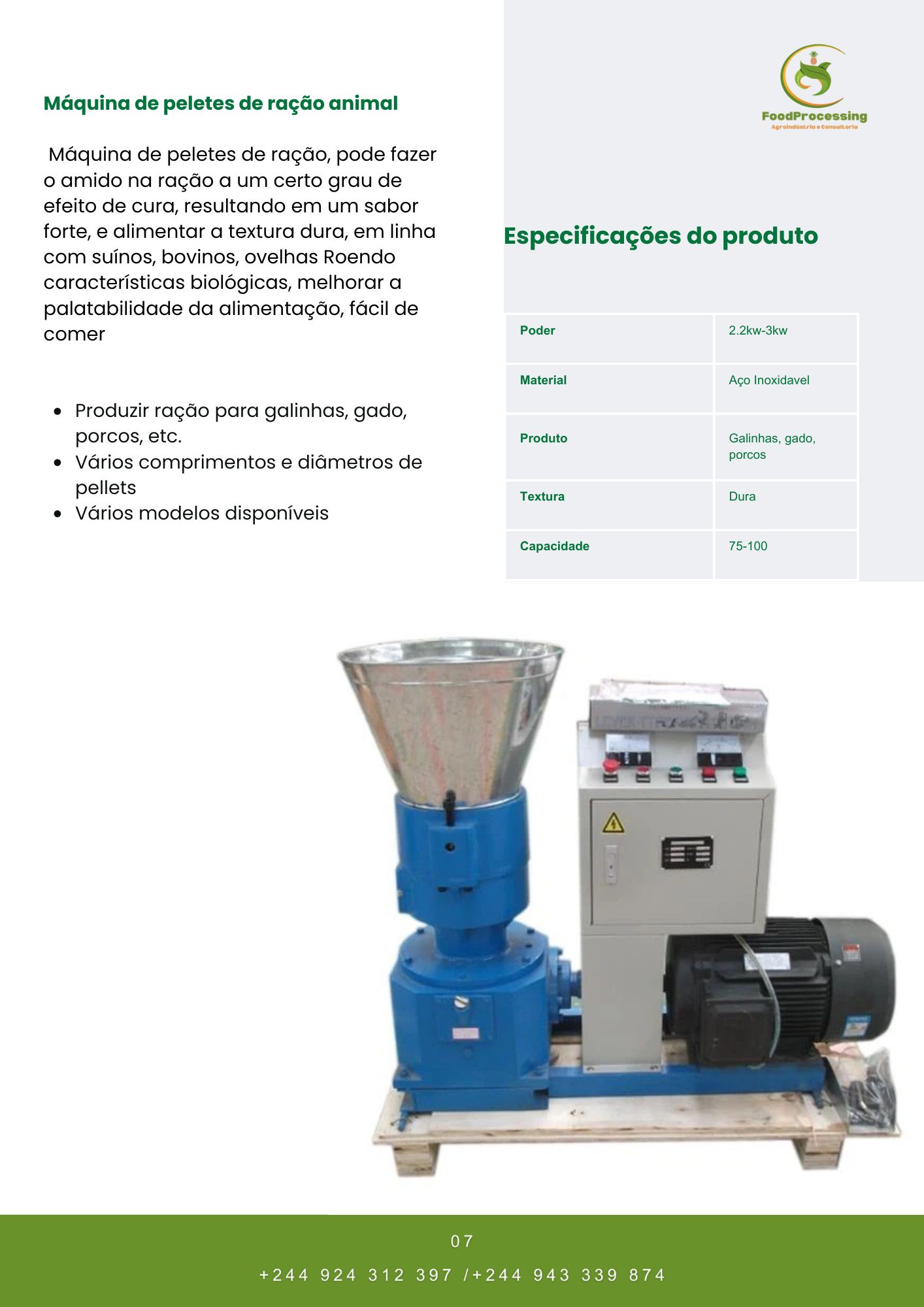 Com potência entre 2.2 kW e 3 kW, a máquina oferece excelente capacidade produtiva, variando de 75 a 100 kg/h, ideal tanto para pequenas produções quanto para propriedades rurais e mini fábricas de ração.
