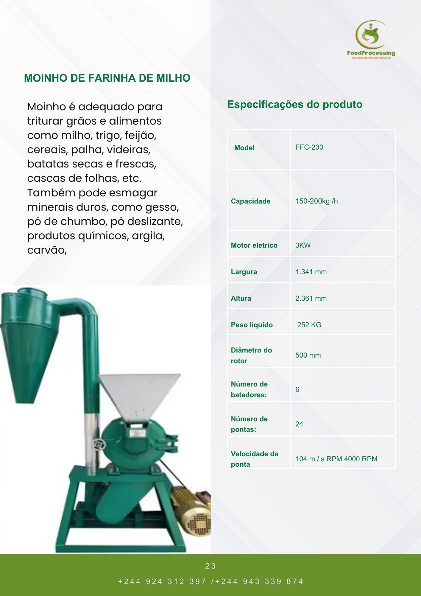 O Moinho de Farinha de Milho FFC-230 é um equipamento versátil e de alta performance, desenvolvido para triturar uma grande variedade de grãos e materiais. Ideal para atividades agrícolas, produção alimentar, pequenas indústrias e processamento de produtos secos.