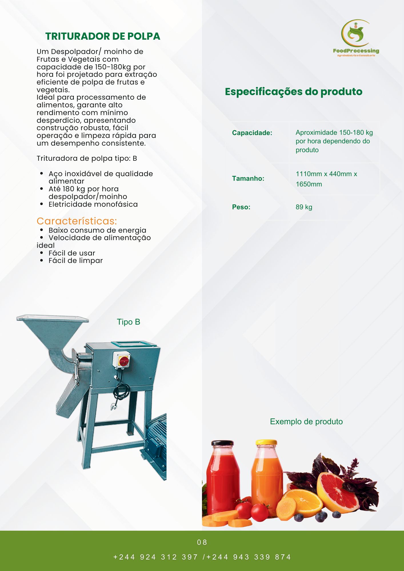 O triturador industrial de frutas e vegetais pode triturar frutas e vegetais com eficiência em pequenos pedaços para prepará-los para os processos de produção subsequentes. Esta máquina trituradora é amplamente usada na produção de sucos e no tratamento de resíduos alimentares. Além disso, pode ser usada como uma unidade autônoma e integrada a outros equipamentos em uma linha de produção. Aplicações: Ideal para processar frutas e vegetais macios, além de frutas sem caroço que foram pré-cozidas ou amolecidas, por exemplo, tomates, kiwis, amoras, morangos, maçãs, peras, etc.